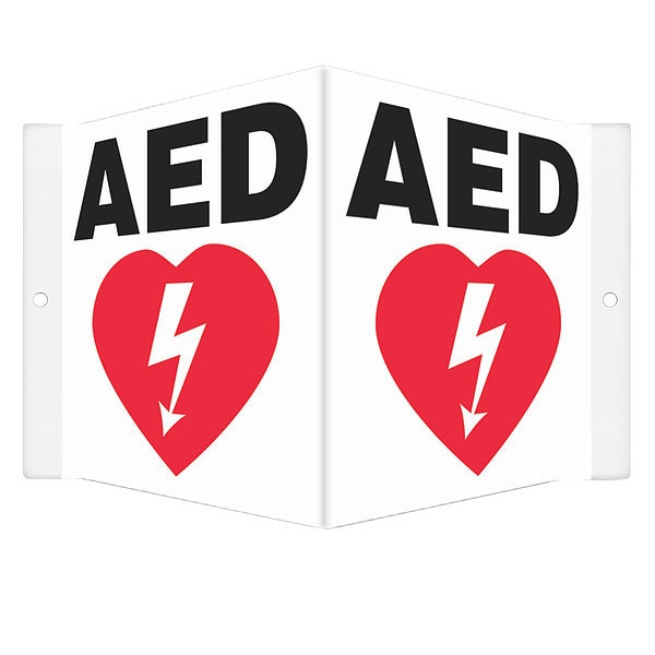 High Visibility Safety Sign, V-Shape Projection, Number of Printed Sides 1, English, Sign Legend AED, Sign Legend Background Color White, Sign Legend Style Symbol and Text