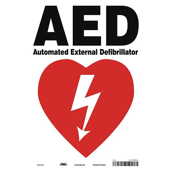AED Automated External Defibrillator, 10 in W x 14 in H, Vertical Rectangle, Vinyl, 471U05