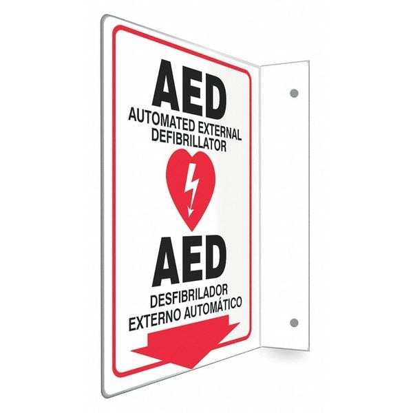 High Visibility Safety Sign, L-Shape Projection, Number of Printed Sides 2, English, Spanish, Sign Legend AED Automatic External Defibrillator/AED Defibrillator Automatizado Externo, Sign Legend Background Color White, Sign Legend Style Symbol and Text