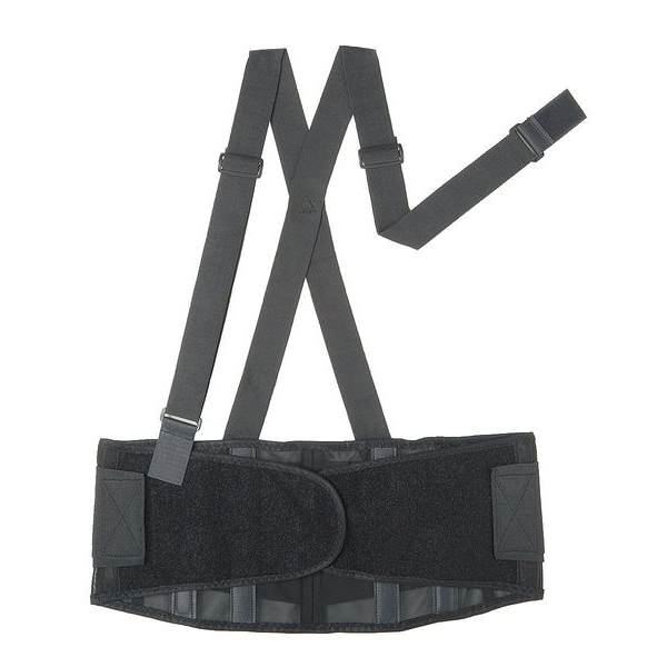Back Support with Stay, Color Black, Material Polyester, Size L, Waist Size - Minimum 34 in, Waist Size - Maximum 38 in, Support Height 8 1/4 in, Closure Double Hook-and-Loop, Includes Suspenders Includes Suspenders, Suspender Attachment Detachable, Features 4 Support Stays, Suspender Length 44 1/2 in, Latex Content Contains Latex, Gender Unisex