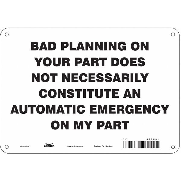 Safety Sign, Vertical Rectangle, Number of Printed Sides 1, English, Sign Legend Bad Planning On Your Part Does Not Necessarily Constitute An Automatic Emergency On My Part, Sign Legend Background Color White, Sign Legend Style Text