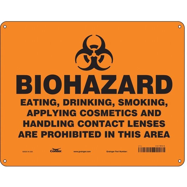 Biohazard Sign, Horizontal Rectangle, Number of Printed Sides 1, English, Sign Format Other Format, Sign Legend Biohazard Eating, Drinking, Smoking, Applying Cosmetics And Handling Contact Lenses Are Prohibited In This Area, Sign Legend Background Color Orange, Sign Legend Style Symbol and Text
