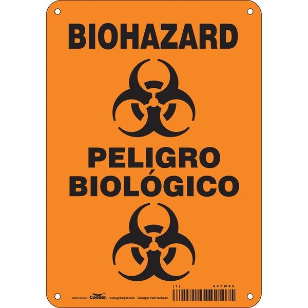 Biohazard Sign, 10 in Height, 7 in Width, Aluminum, Horizontal Rectangle, English, Spanish