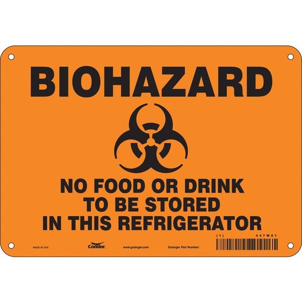 Biohazard Sign, Vertical Rectangle, Number of Printed Sides 1, English, Sign Format Other Format, Sign Legend Biohazard No Food Or Drink To Be Stored In This Refrigerator, Sign Legend Background Color Orange, Sign Legend Style Symbol and Text