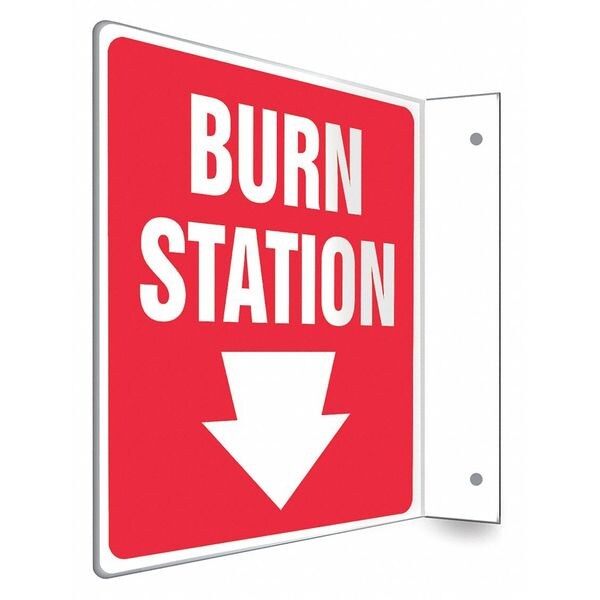 High Visibility Safety Sign, L-Shape Projection, Number of Printed Sides 2, English, Sign Legend Burn Station, Sign Legend Background Color Red, Sign Legend Style Symbol and Text