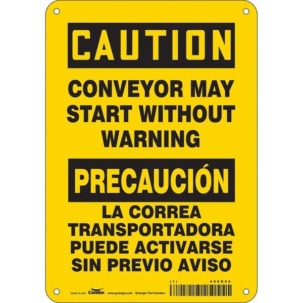 Safety Sign, Horizontal Rectangle, Number of Printed Sides 1, English, Spanish, Sign Format Traditional OSHA, Sign Legend Conveyor May Start Without Warning/La Banda Transportadora Puede Activarse Sin Previo Aviso, Sign Legend Background Color Yellow, Sign Legend Style Text