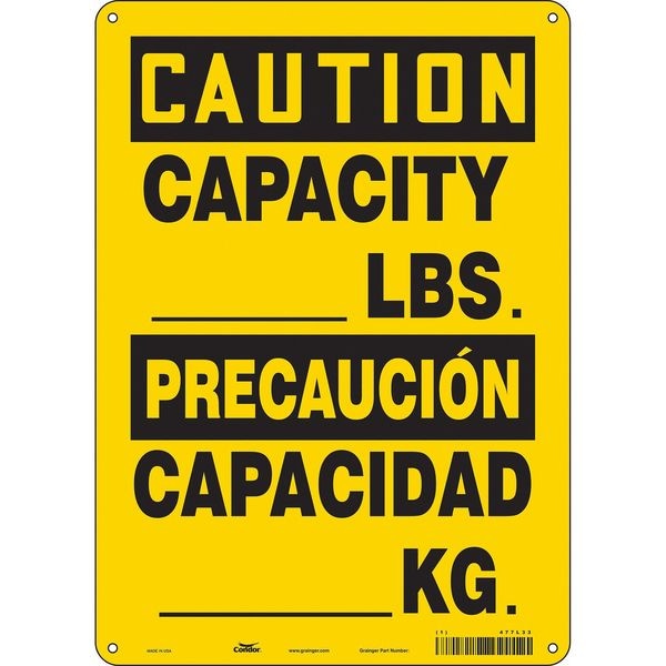 Safety Sign, Vertical Rectangle, Number of Printed Sides 1, English, Spanish, Sign Format Traditional OSHA, Sign Legend Capacity _______ Lbs./Capacidad _______ Kg., Sign Legend Background Color Yellow, Sign Legend Style Text