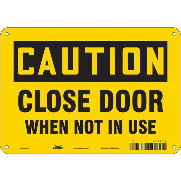 Caution, Close Door When Not In Use, 10 in W x 7 in H, Vertical Rectangle, Polyethylene, 471W79