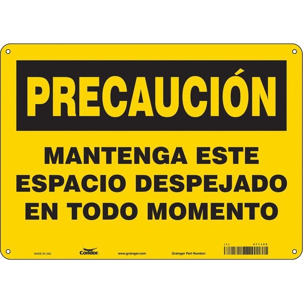 Safety Sign, Horizontal Rectangle, Number of Printed Sides 1, Spanish, Sign Format Traditional OSHA, Sign Legend Mantenga Este Espacio Despejado En Todo Momento, Sign Legend Background Color Yellow, Sign Legend Style Text
