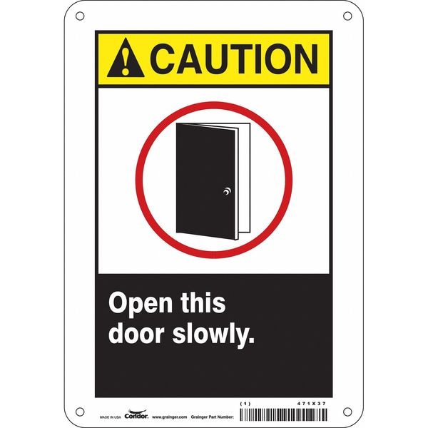 Safety Sign, Horizontal Rectangle, Number of Printed Sides 1, English, Sign Legend Open This Door Slowly., Sign Legend Background Color Black, White, Sign Legend Style Symbol and Text