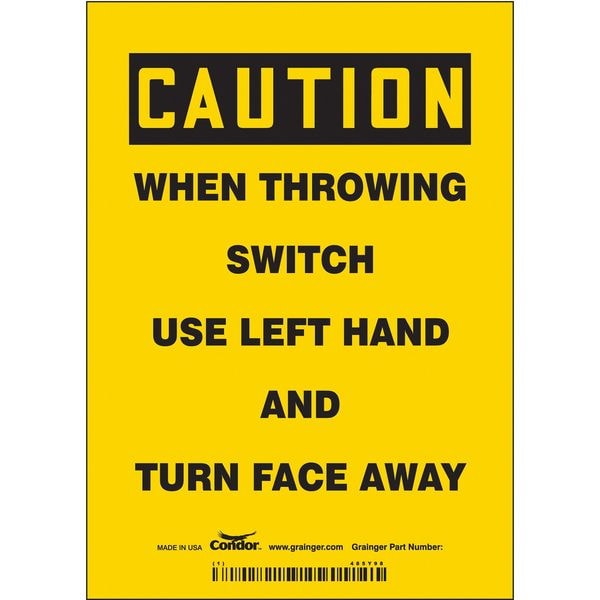 Safety Sign, Vertical Rectangle, Number of Printed Sides 1, English, Sign Format Traditional OSHA, Sign Legend When Throwing Switch Use Left Hand And Turn Face Away, Sign Legend Background Color Yellow, Sign Legend Style Text