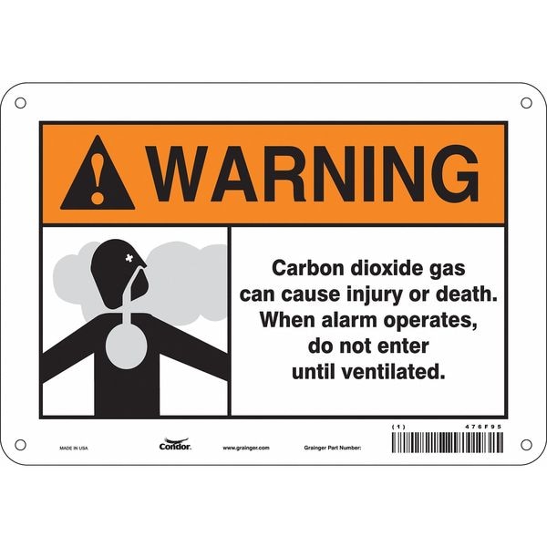 Chemical Sign, Vertical Rectangle, Number of Printed Sides 1, English, Sign Format ANSI/OSHA Format, Sign Legend Carbon Dioxide Gas Can Cause Injury Or Death. When Alarm Operates, Do Not Enter Until Ventilated., Sign Legend Background Color White, Sign Legend Style Symbol and Text