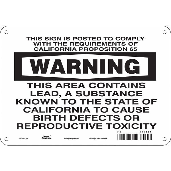 Chemical Sign, Vertical Rectangle, Number of Printed Sides 1, English, Sign Format Other Format, Sign Legend This Sign Is Posted To Comply With The Requirements Of California Proposition 65 This Area Contains Lead, A Substance Known To The State Of California To Cause Birth Defects Or Reproductive Toxicity, Sign Legend Background Color White, Sign Legend Style Text