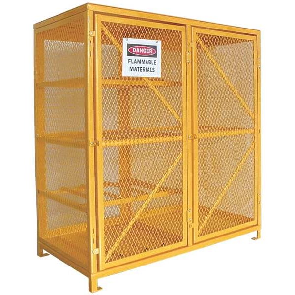 Cylinder Storage Cabinet, Assembled Unassembled, Color Yellow, Compatible Tank Size 20 lb to 48 lb, Construction Angle Iron Frame, Expanded Metal, Cylinder Storage Orientation Horizontal and Vertical, Door Closure Type Manual, Door Handle Type Hasp Lock, Door Type Hinged, Exterior Depth 30 in, Exterior Height 65 in, Exterior Width 60 in, Finish Powder Coated, Fire Lined Fire Lining Not Included, Horizontal Cylinder Capacity 8, Includes Predrilled Holes for Mounting, Lock Type Padlock