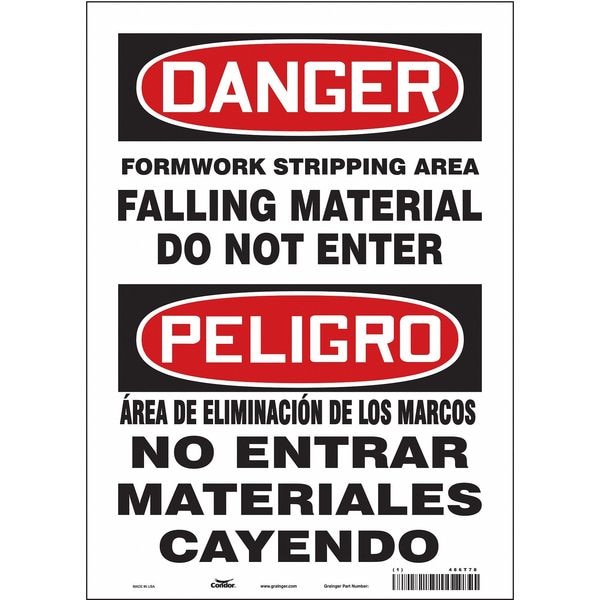 Safety Sign, Vertical Rectangle, Number of Printed Sides 1, English, Spanish, Sign Format Traditional OSHA, Sign Legend Formwork Stripping Area Falling Material Do Not Enter/No Entrar Materiales Cayendo, Sign Legend Background Color White, Sign Legend Style Text