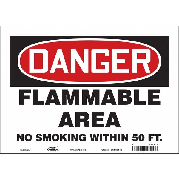 Danger Sign, Horizontal Rectangle, Number of Printed Sides 1, English, Sign Format Traditional OSHA, Sign Legend Flammable Area No Smoking Within 50 Ft., Sign Legend Background Color White, Sign Legend Style Text