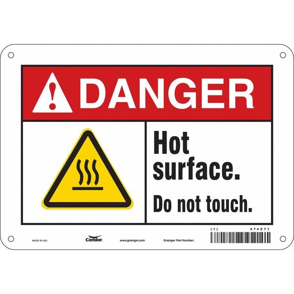 Danger Sign, Vertical Rectangle, Number of Printed Sides 1, English, Sign Format ANSI/OSHA Format, Sign Legend Hot Surface. Do Not Touch., Sign Legend Background Color White, Sign Legend Style Symbol and Text