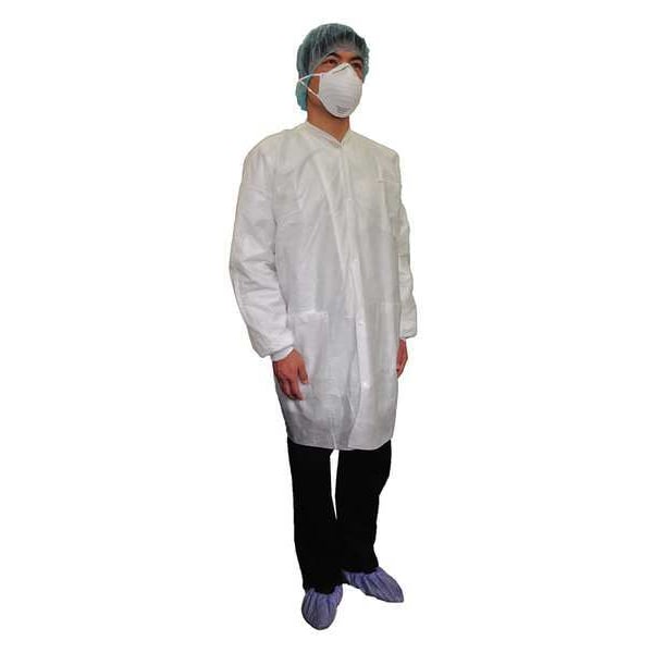 Disposable Lab Coat, Anti-Static No, Attached Hood No, Chest Size - Maximum 45 1/2 in, Clean Process Status Not Clean Processed, Closure Type Snaps, Collar Style Knit, Color White, Cuff Style Elastic Knit, Gender Unisex, Hazard Type Non-Hazardous Dry Particulates, Non-Hazardous Liquids, Height - Maximum 74 in, Height - Minimum 71 1/2 in, ISO Cleanroom Class Not Applicable, Launderable No, Liquid Dispersal Type Splash, Material SMS, Material Weight 45 g/sq m, Named Size XL, Number of Pockets 3