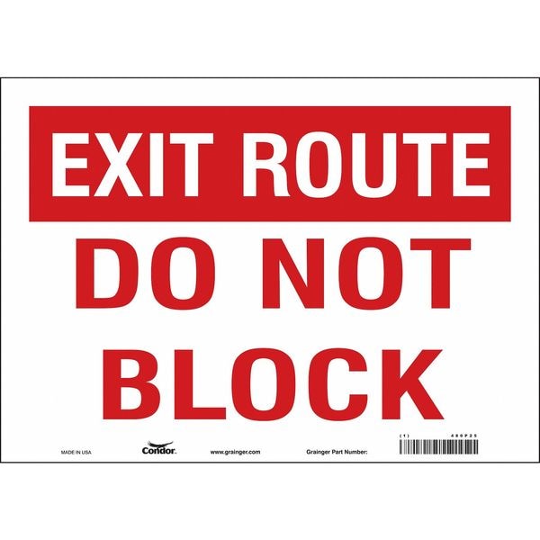Safety Sign, Horizontal Rectangle, Number of Printed Sides 1, English, Sign Legend Exit Route Do Not Block, Sign Legend Background Color Red, White, Sign Legend Style Text