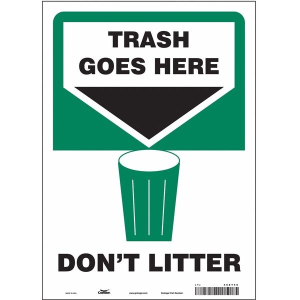 Safety Sign, Vertical Rectangle, Number of Printed Sides 1, English, Sign Format Other Format, Sign Legend Trash Goes Here Don't Litter, Sign Legend Background Color Green, White, Sign Legend Style Symbol and Text