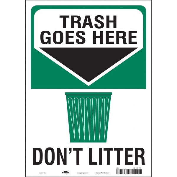Safety Sign, Vertical Rectangle, Number of Printed Sides 1, English, Sign Format Other Format, Sign Legend Trash Goes Here Don't Litter, Sign Legend Background Color Green, White, Sign Legend Style Symbol and Text