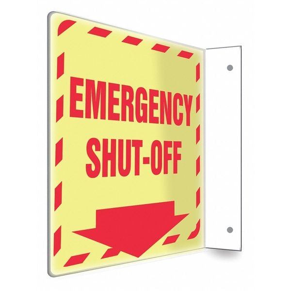 High Visibility Safety Sign, L-Shape Projection, Number of Printed Sides 2, English, Sign Format Other Format, Sign Legend Emergency Shut-Off, Sign Legend Background Color White, Sign Legend Style Symbol and Text