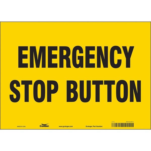 SAFETY SIGN FIRE AND EMERGENCY, Horizontal Rectangle, Number of Printed Sides 1, English, Sign Legend Emergency Stop Button, Sign Legend Background Color Yellow, Sign Legend Style Text