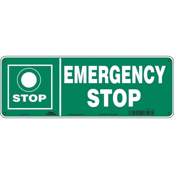 SAFETY SIGN FIRE AND EMERGENCY, Vertical Rectangle, Number of Printed Sides 1, English, Sign Legend Stop/Emergency Stop, Sign Legend Background Color Green, White, Sign Legend Style Symbol and Text