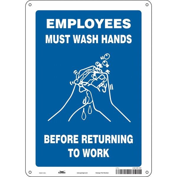 Safety Sign, Vertical Rectangle, Number of Printed Sides 1, English, Sign Legend Employees Must Wash Hands Before Returning To Work, Sign Legend Background Color Blue, Sign Legend Style Symbol and Text
