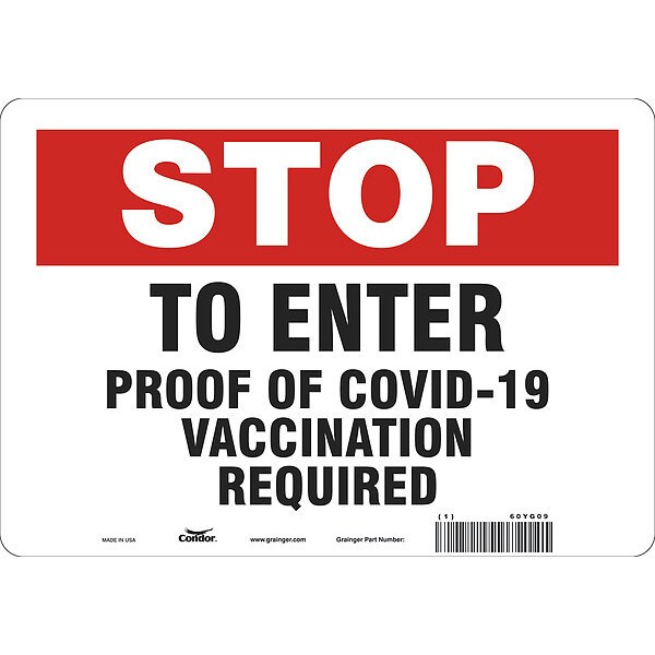 Employee/Visitor Vaccine Proof Sign, Height 7 in, Width 10 in, Sign Material Polyethylene, Header Stop, Legend To Enter Proof Of COVID-19 Vaccination Required, Printed Language English