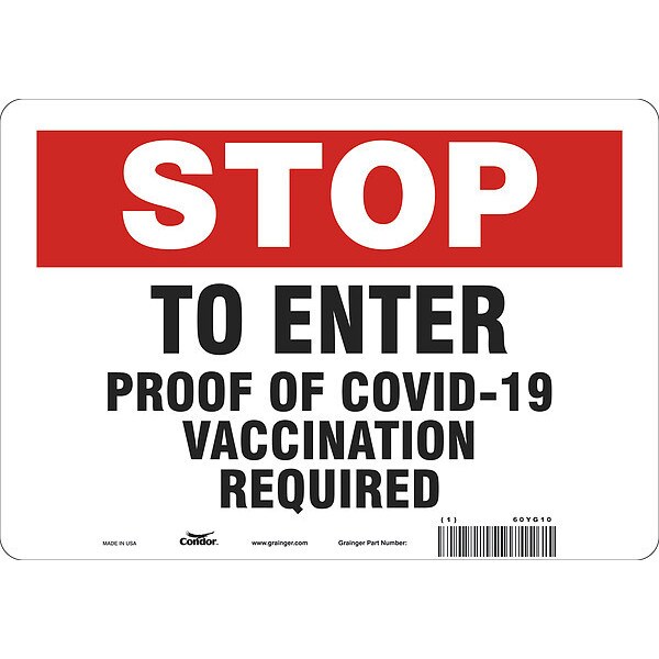 Employee/Visitor Vaccine Proof Sign, Height 7 in, Width 10 in, Sign Material Vinyl, Header Stop, Legend To Enter Proof Of COVID-19 Vaccination Required, Printed Language English