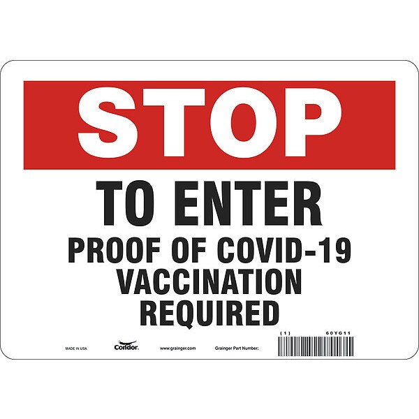 Employee/Visitor Vaccine Proof Sign, Height 10 in, Width 14 in, Sign Material Aluminum, Header Stop, Legend To Enter Proof Of COVID-19 Vaccination Required, Printed Language English