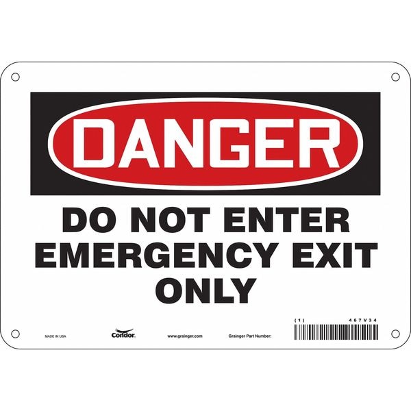 Exit Sign, Aluminum, 10" W, 7" H, DANGER DO NOT ENTER EMERGENCY EXIT ONLY, White