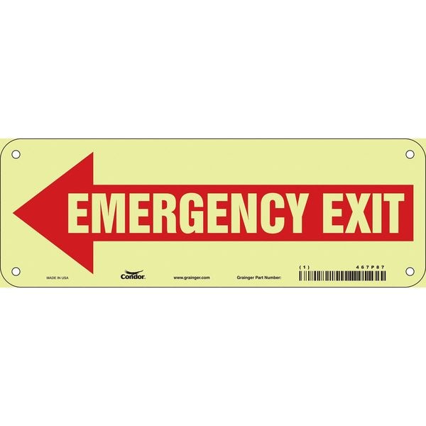 Exit Sign, Plastic, 10" W, 3-1/2" H, EMERGENCY EXIT W/SYMBOL, Red