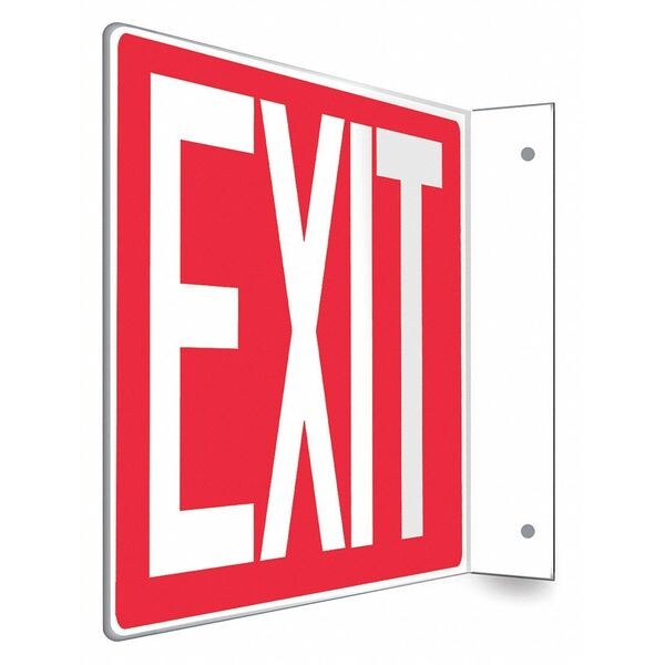 High Visibility Safety Sign, L-Shape Projection, Number of Printed Sides 2, English, Sign Legend Exit, Sign Legend Background Color Red, Sign Legend Style Text