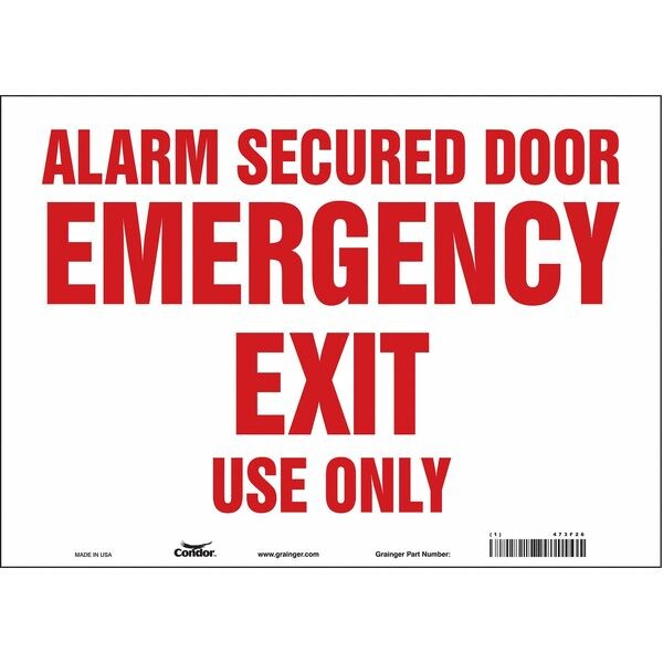 Safety Sign, Horizontal Rectangle, Number of Printed Sides 1, English, Sign Legend Alarm Secured Door Emergency Exit Use Only, Sign Legend Background Color White, Sign Legend Style Text