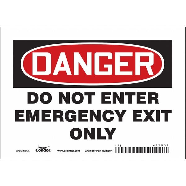 Exit Sign, Vinyl, 7" W, 5" H, DANGER DO NOT ENTER EMERGENCY EXIT ONLY, White