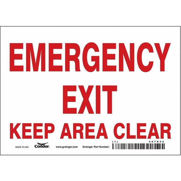 Safety Sign Emergency Exit, Horizontal Rectangle, Number of Printed Sides 1, English, Sign Legend Emergency Exit Keep Area Clear, Sign Legend Background Color White, Sign Legend Style Text
