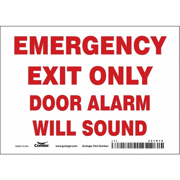 Safety Sign Emergency Exit, Horizontal Rectangle, Number of Printed Sides 1, English, Sign Legend Emergency Exit Only Door Alarm Will Sound, Sign Legend Background Color White, Sign Legend Style Text