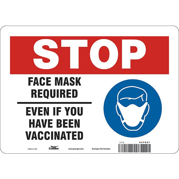 Facemask Reminder Safety Sign, Height 10 in, Width 14 in, Sign Material Vinyl, Header Stop, Legend Face Mask Required Even If You Have Been Vaccinated, Printed Language English