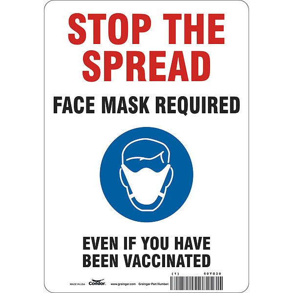 Facemask Reminder Safety Sign, Height 10 in, Width 7 in, Sign Material Aluminum, Header Stop The Spread, Legend Face Mask Required Even If You Have Been Vaccinated, Printed Language English