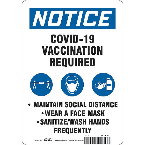 Facemask Reminder Safety Sign, Height 10 in, Width 7 in, Sign Material Polyethylene, Header Notice, Legend Covid Vaccination Required Maintain Social Distance Wear A Face Mask Sanitize/Wash Hands Frequently, Printed Language English