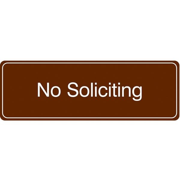 Facility Sign, Horizontal Rectangle, Number of Printed Sides 1, English, Sign Format Other Format, Sign Legend No Soliciting, Sign Legend Background Color Brown, Sign Legend Style Text