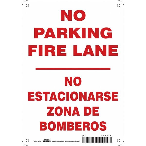 Fire Lane, Zone & Equipment No Parking Sign, Height 10 in, Width 7 in, Sign Material Aluminum, Sign Mounting Style Mounting Holes, Printed Language English, Spanish, Sign Shape Vertical Rectangle