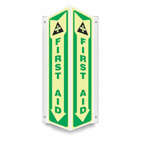 High Visibility Safety Sign, V-Shape Projection, Number of Printed Sides 1, English, Sign Format Other Format, Sign Legend First Aid, Sign Legend Background Color Green, White, Sign Legend Style Symbol and Text