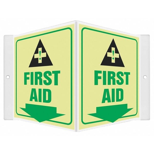 High Visibility Safety Sign, V-Shape Projection, Number of Printed Sides 1, English, Sign Format Other Format, Sign Legend First Aid, Sign Legend Background Color White, Sign Legend Style Symbol and Text
