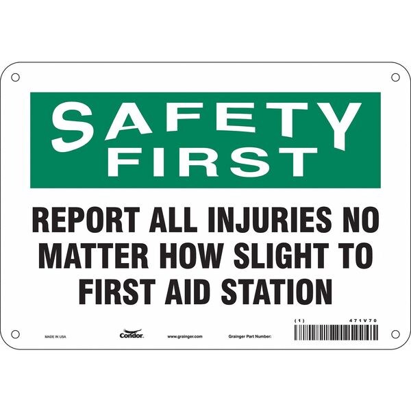 First Aid Sign, Vertical Rectangle, Number of Printed Sides 1, English, Sign Format Traditional OSHA, Sign Legend Report All Injuries No Matter How Slight To First Aid Station, Sign Legend Background Color White, Sign Legend Style Text