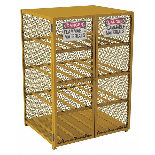 Cylinder Storage Cabinet, Assembled Assembled, Color Yellow, Compatible Tank Size 50 lb, Construction Welded, Cylinder Storage Orientation Horizontal, Door Closure Type Self-Closing, Door Handle Type Hasp Lock, Door Type Hinged, Exterior Depth 42 in, Exterior Height 71 3/4 in, Exterior Width 50 in, Finish Powder Coated, Fire Lined Fire Lining Not Included, Horizontal Cylinder Capacity 12, Includes (2) Identification Labels, (2) Warning Labels, Lock Type Padlock, Material Steel