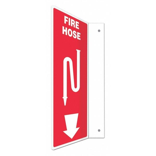High Visibility Safety Sign, L-Shape Projection, Number of Printed Sides 2, English, Sign Legend Fire Hose, Sign Legend Background Color Red, Sign Legend Style Symbol and Text