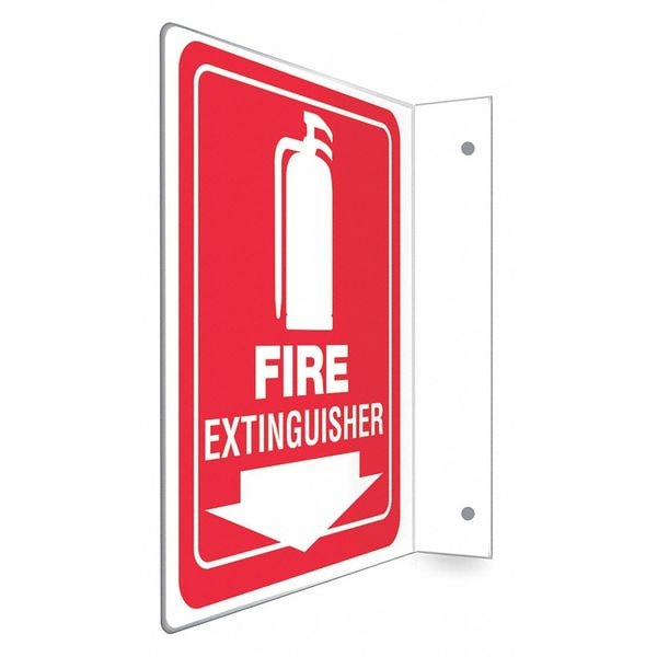 High Visibility Safety Sign, L-Shape Projection, Number of Printed Sides 2, English, Sign Legend Fire Extinguisher, Sign Legend Background Color Red, Sign Legend Style Symbol and Text